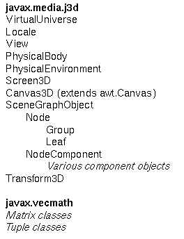 Java 3D defines several basic classes that are used to construct and manipulate a scene graph and to control viewing and rendering. Figure 1-1 shows the overall object hierarchy used by Java 3D. Subsequent chapters provide more detail for specific portions of the hierarchy.Overview of Java 3D Object Hierarchy