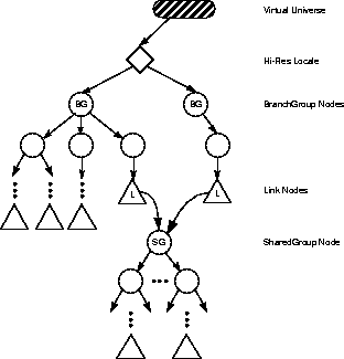 An application that wishes to share a subgraph from multiple places in a scene graph must do so through the use of the Link leaf node and an associated SharedGroup node. The SharedGroup node serves as the root of the shared subgraph. The Link leaf node refers to the SharedGroup node. It does not incorporate the shared scene graph directly into its scene graph.Sharing Subgraphs