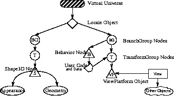The virtual world is a common space in which virtual objects exist. The virtual world coordinate system exists relative to a high-resolution Locale-each Locale object defines the origin of virtual world coordinates for all of the objects attached to that Locale. The Locale that contains the currently active ViewPlatform object defines the virtual world coordinates that are used for rendering. Java3D eventually transforms all coordinates associated with scene graph elements into this common virtual world space.The Virtual World