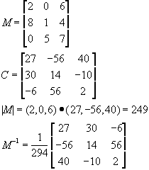 From Hill, pp687: 1. Build a matrix of cofactors, C 2. Find |M| as the dot product of any row in C with a corresponding row of M 3. Transpose C and divide by |M|