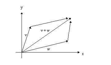 vectors add according to the parallelogram rule: to add the vectors v and w, take an arrow from the origin to w, translate it such that its base is at the point v, and define v+w as the new endpoint of the arrow: