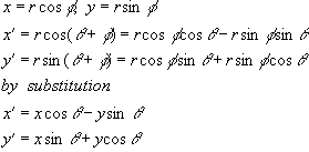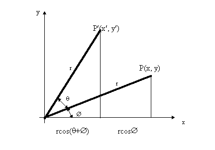 The angle of rotation is about the origin. Positive angles are measured counterclockwise. As an exercise, you should be able to reformulate the rotational transformations for negative angles. Use the identities: